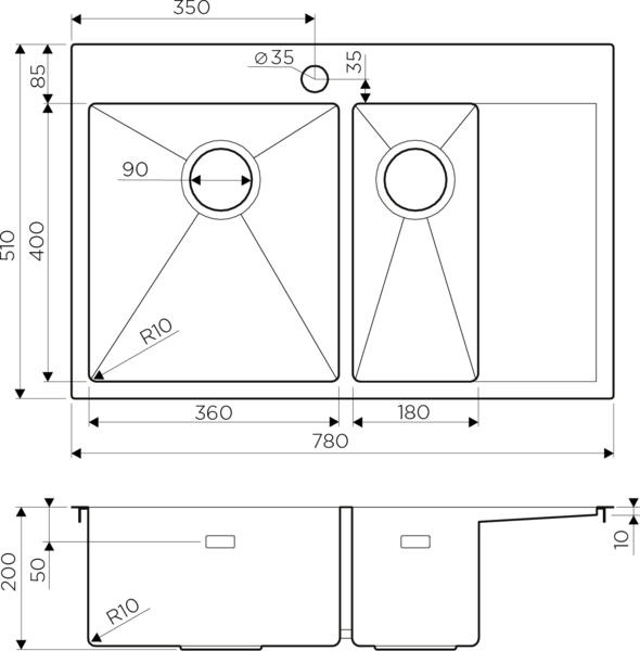 Размер мойки, мм: 780x510