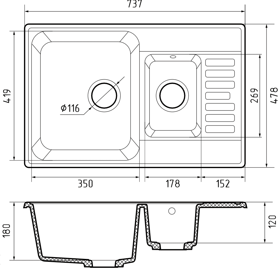 Размер чаши: 350x419x180 мм, 178x269x120 мм