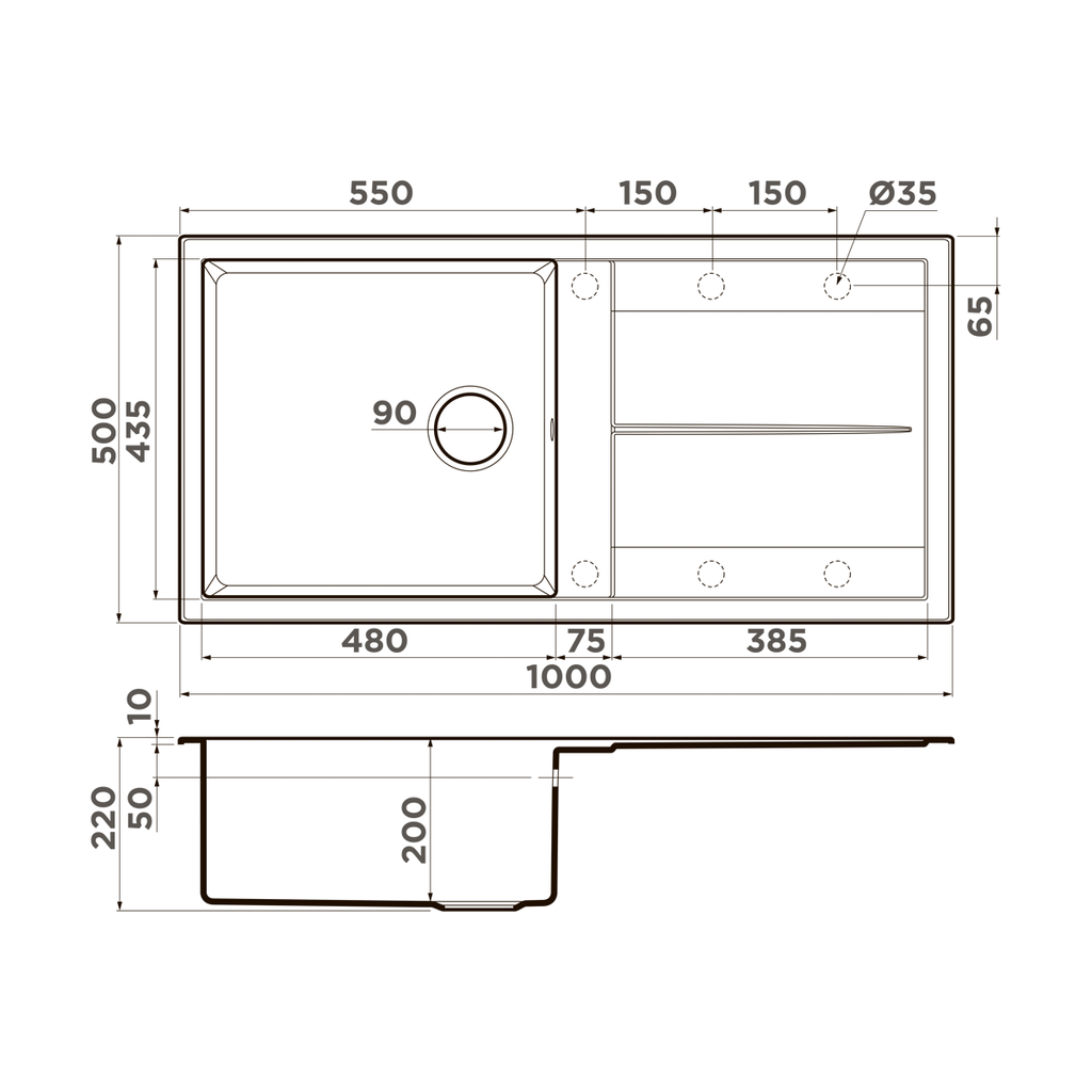 Размер мойки, мм: 1000x500