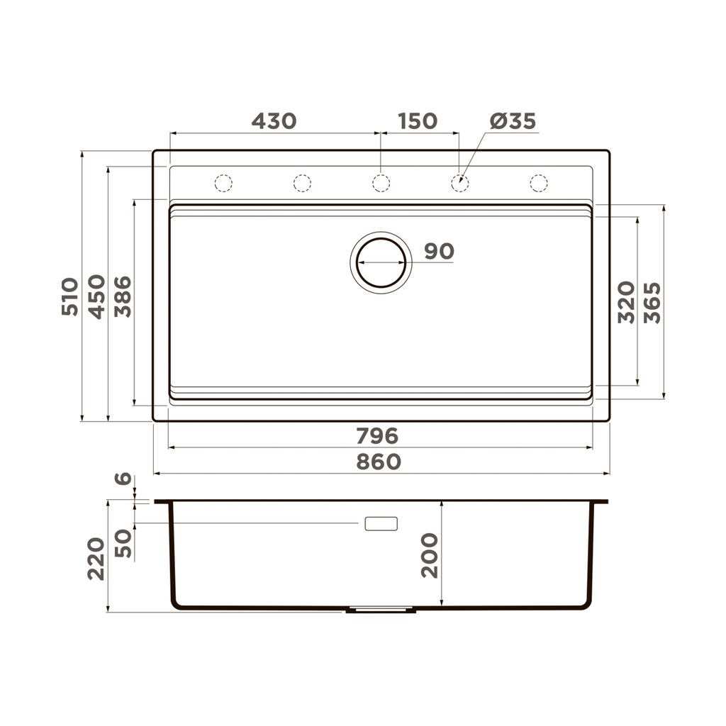 Размер мойки, мм: 860x510