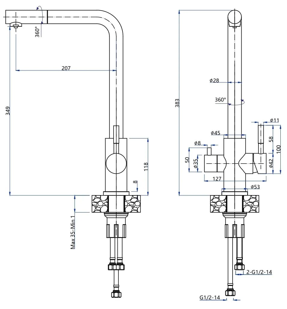 Вращение излива позволит Вам удобно располагать его во время мойки посуды. В излив смесителя уже установлен аэратор, это экономит воду во время мытья, и сохраняет тишину.