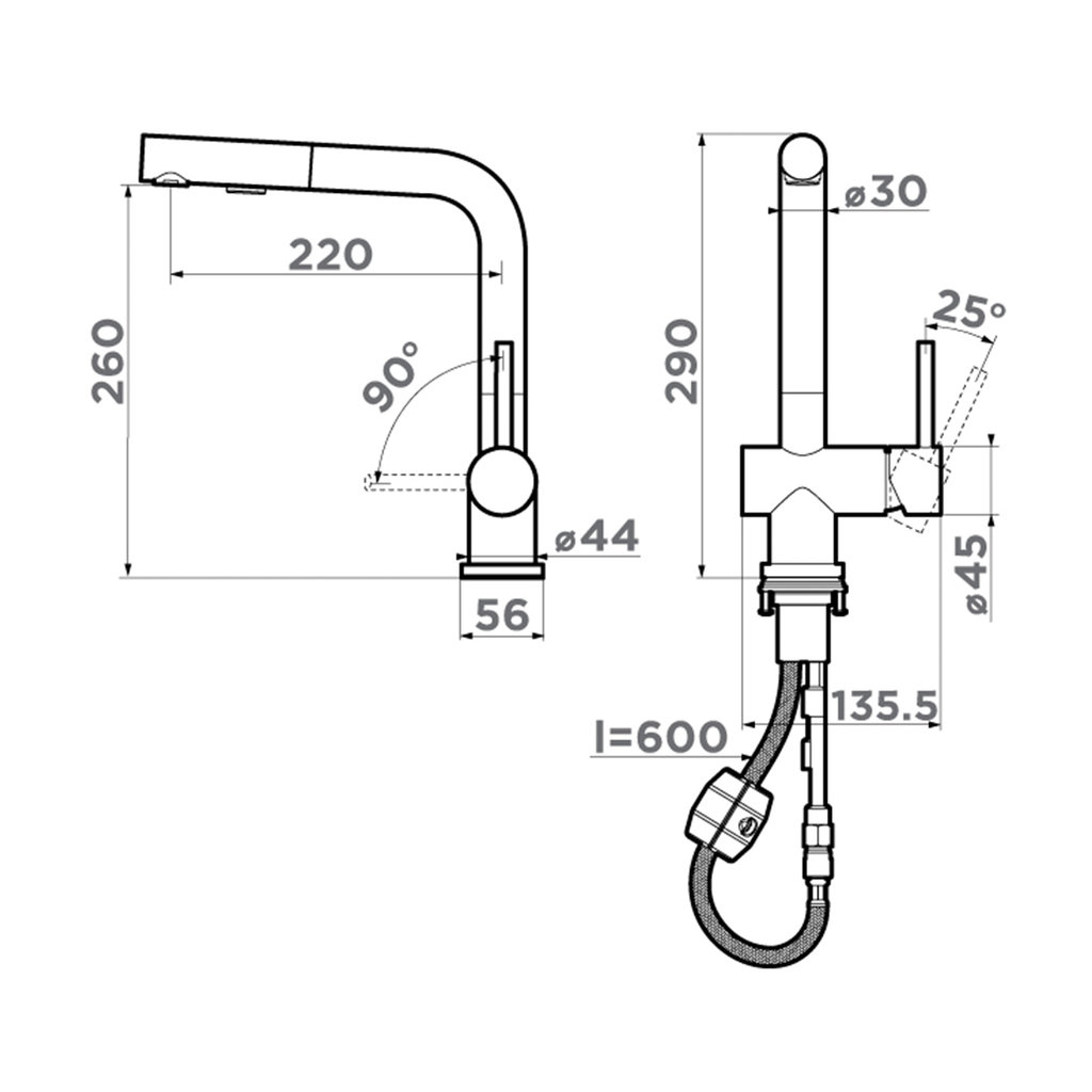 Особенности: угол поворота ручки может отличаться в зависимости от партии, вытяжной шланг до 600 мм