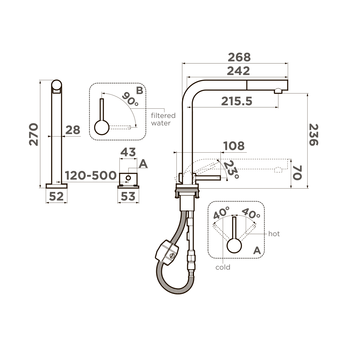 Особенности: вытяжной шланг до 400 мм, установка под окно, отдельный рычаг регулировки, Multi - единый рычаг управления для горячей, холодной и питьевой воды, диаметр отверстия для излива 35 мм, диаметр отверстия для ручки управления 43 мм