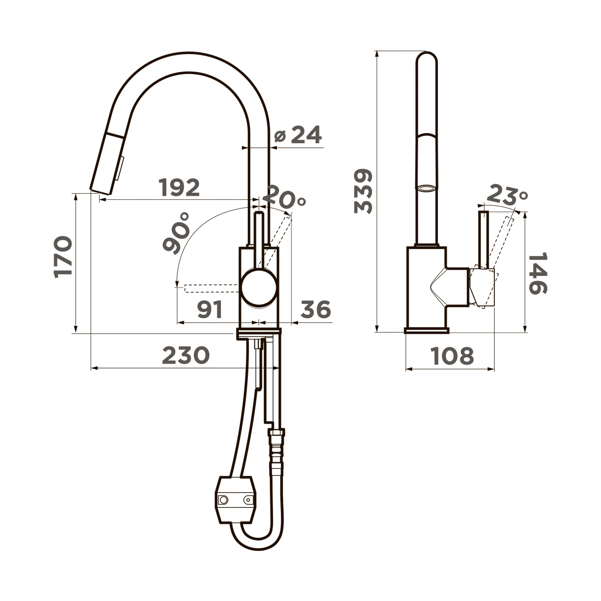 Особенности: вытяжной шланг длиной до 400 мм, кнопка струя / душ