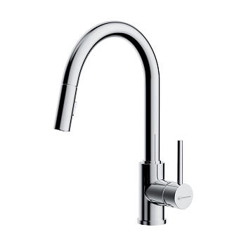 - Практичный однорычажный смеситель выполнен в современном стиле и снабжен вытяжным шлангом.