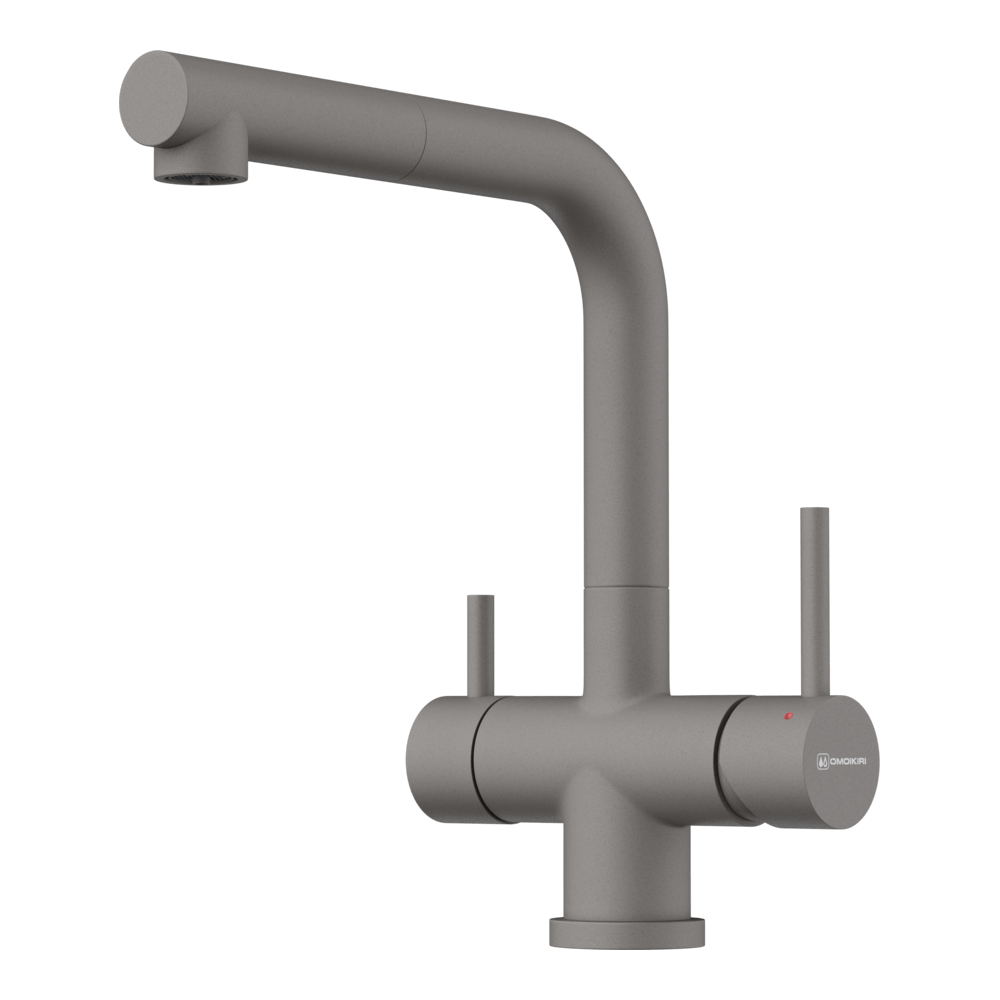 - Смеситель OMOIKIRI в категории 3 в 1: функция подачи холодной/горячей воды, возможность подключения фильтров для очистки и наличие вытяжного шланга.