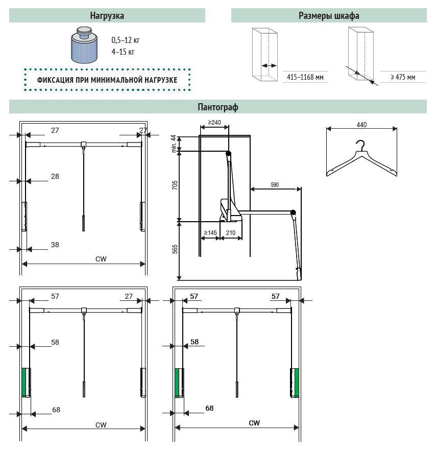 Общая нагрузка на механизм включает в себя: полезная нагрузка + собственный вес механизма 2 кг (максимальный вес ручки-тяги и штанги для одежды).