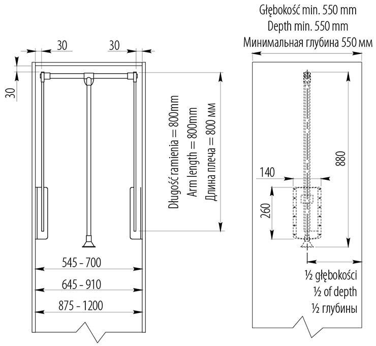 - Телескопическая штанга перед установкой в шкаф регулируется в пределах 60-83 см.