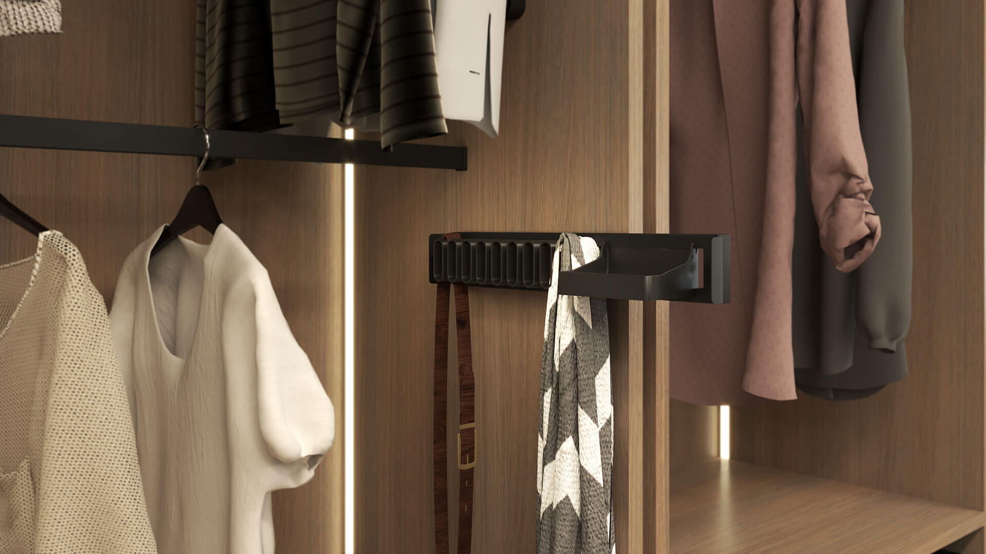 Держатели для ремней и галстуков — решение, которое создает дополнительное пространство для хранения под вешалками для одежды или на внутренней стороне фасада.
