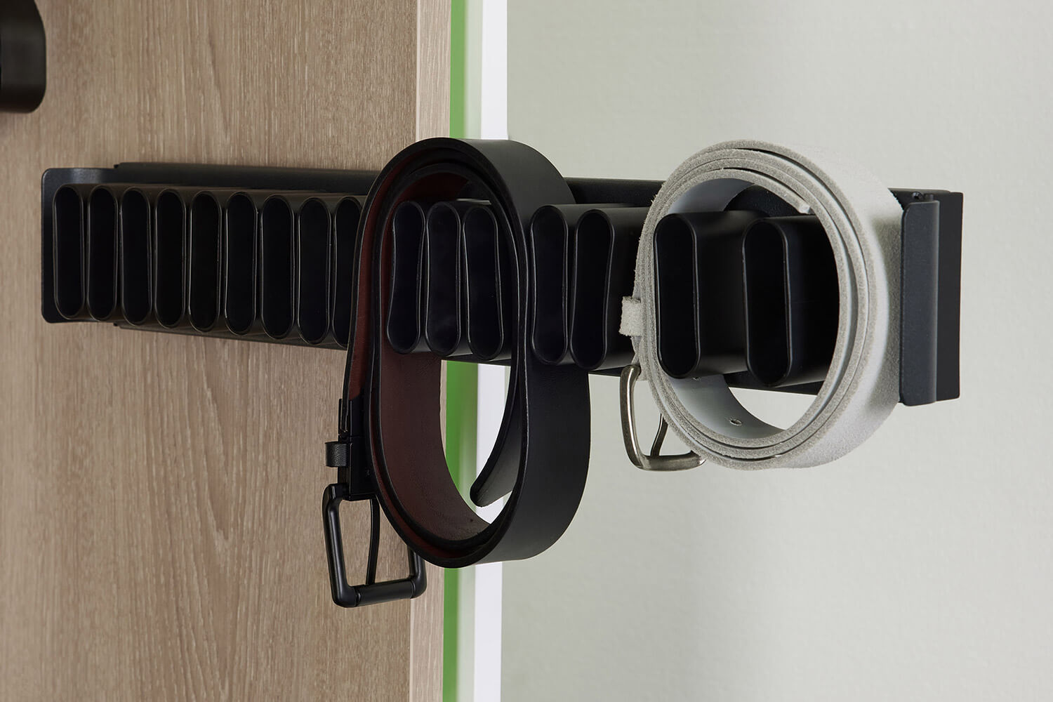 Держатели для ремней и галстуков — решение, которое создает дополнительное пространство для хранения под вешалками для одежды или на внутренней стороне фасада.