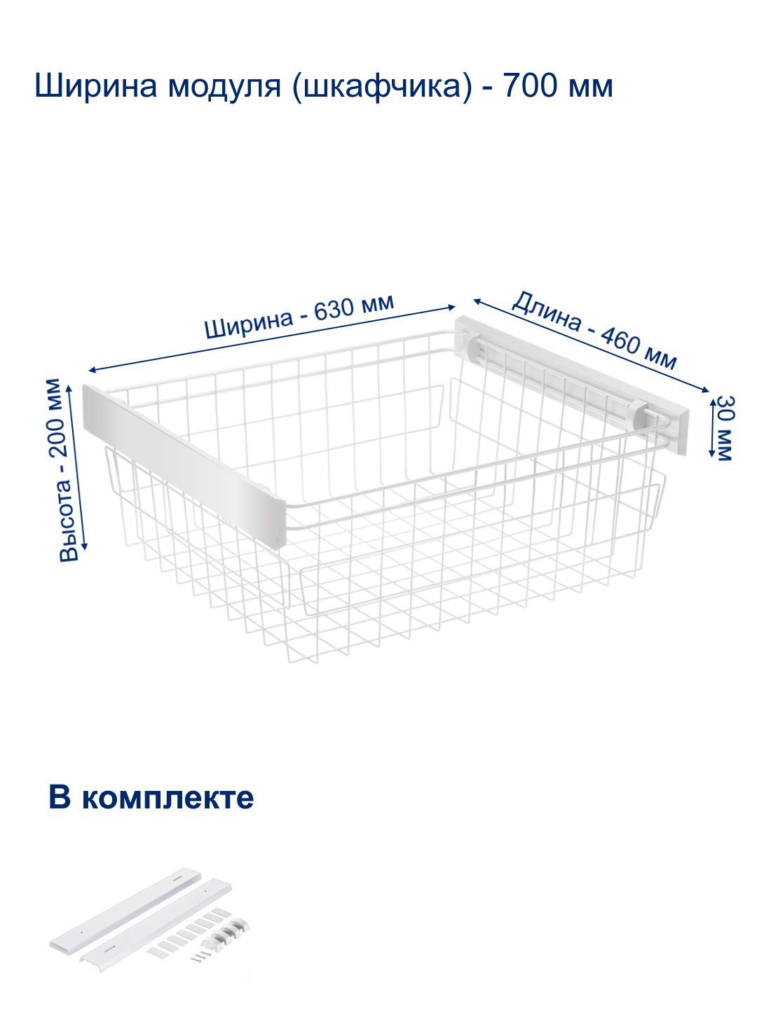 Корзина предназначена для модуля с шириной фасада 700 мм, крепится к боковинам мебельного модуля.