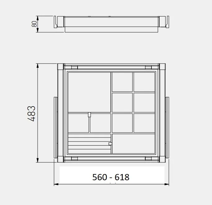 Ширина корзины регулируется в диапазоне 560 - 618 мм.