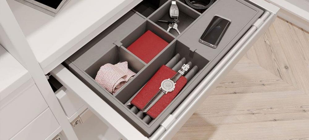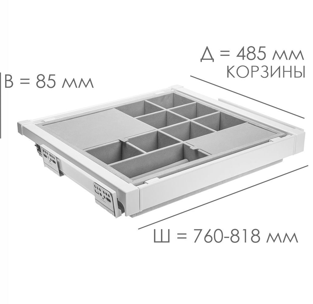 Корзина с органайзером WG-PRZEG80-10 белая, в модуль 800 мм, с доводчиком, полного выдвижения - удобное гардеробное наполнение, предназначенное для хранения аксессуаров, таких как украшения, заколки, часы, ремни, запонки и прочие мелочи. Рабочая поверхность корзины разделена на секции.