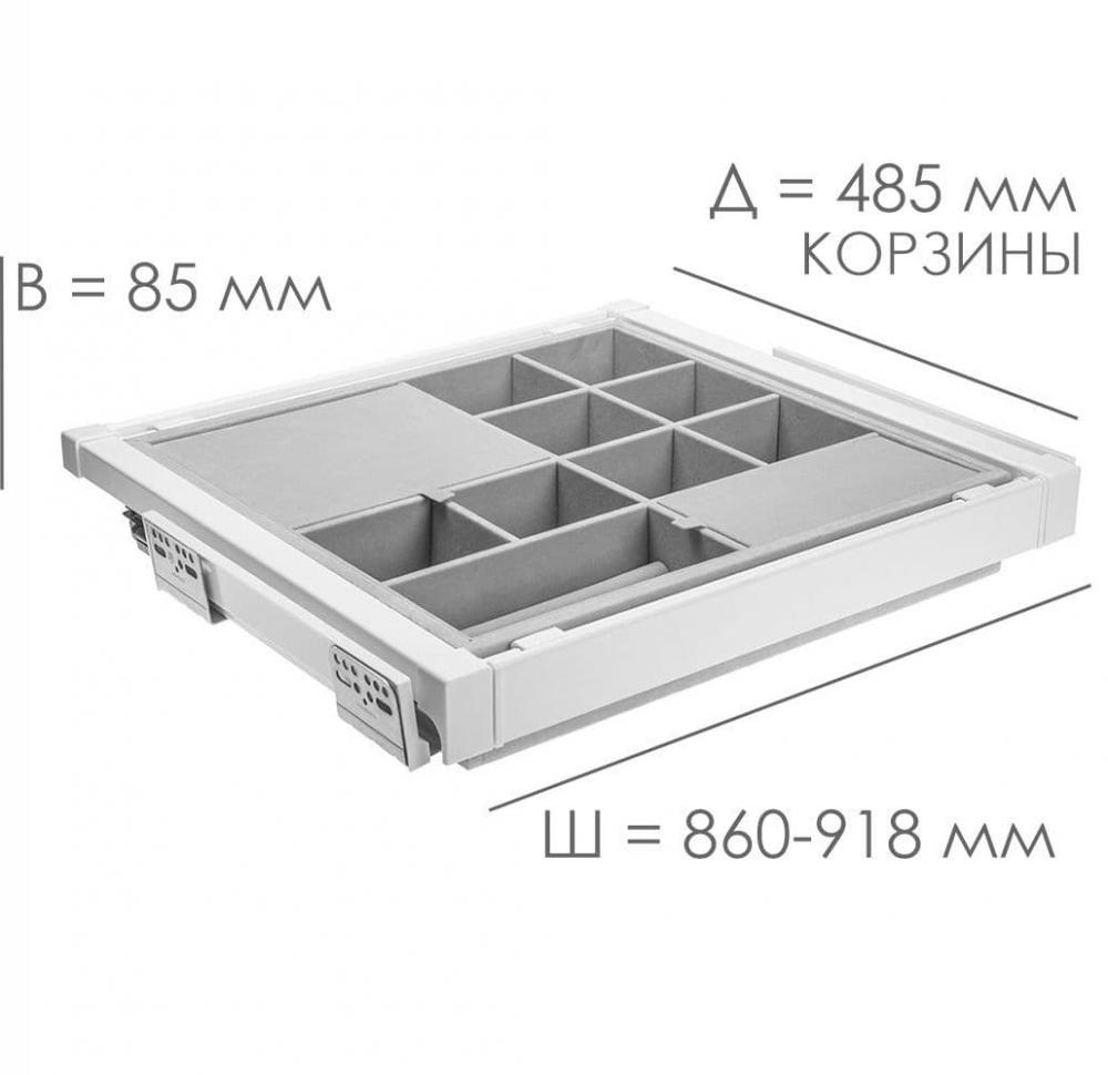 Корзина с органайзером, WG-PRZEG90-10, белая, в модуль 900 мм, с доводчиком, полного выдвижения - удобное гардеробное наполнение, предназначенное для хранения аксессуаров, таких как украшения, заколки, часы, ремни, запонки и прочие мелочи. Рабочая поверхность корзины разделена на секции.