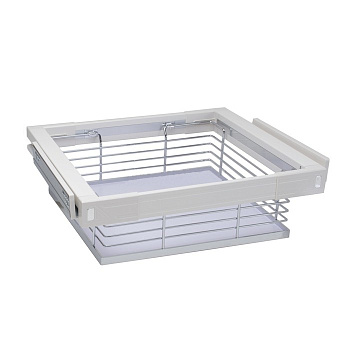 Роскошная корзина полного выдвижения на направляющих скрытого монтажа с доводчиком станет украшением любого шкафа или гардеробной. Прутья хромированы зеркально. Критерием качества этого покрытия является возможность увидеть свое отражение. Так же эту корзину отличает дно из МДФ, которое позволяет хранить в ней мелкие вещи, не боясь, что они могут выпасть.