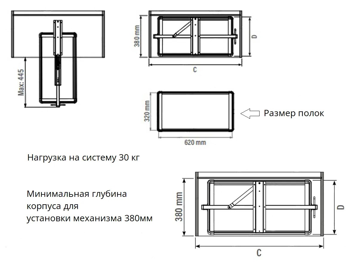 - Минимальная глубина корпуса для установки механизма 380мм.