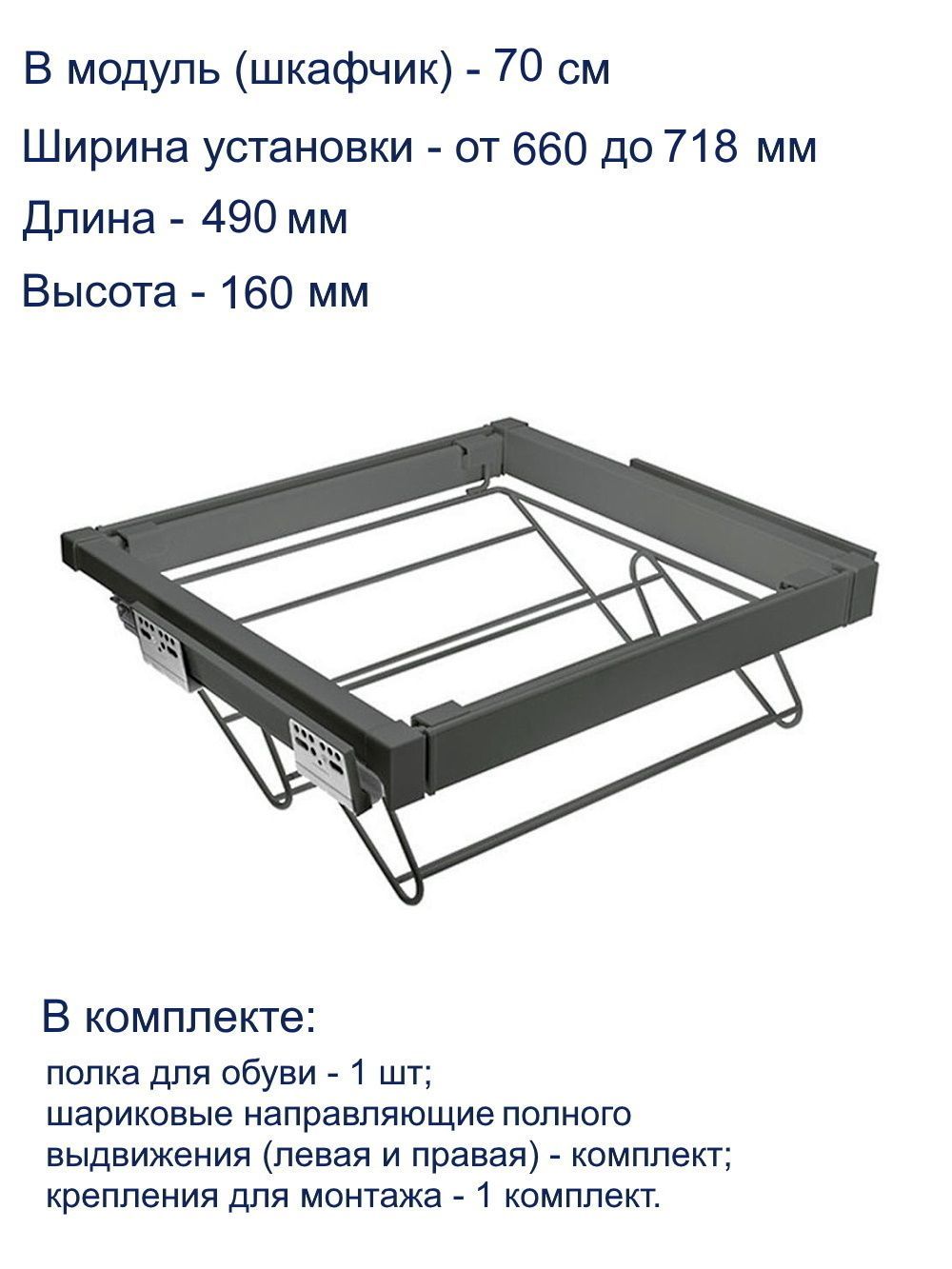 Полка для обуви WG-POBUW70-60, графит, с доводчиком, полного выдвижения - практичный элемент гардеробного наполнения, предназначенный для хранения обуви различного типа и быстрого доступа к ней.