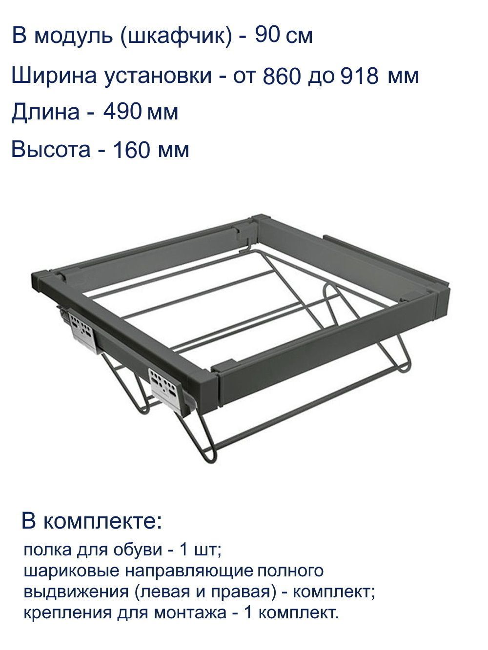 Полка для обуви WG-POBUW90-60, графит, с доводчиком, полного выдвижения - практичный элемент гардеробного наполнения, предназначенный для хранения обуви различного типа и быстрого доступа к ней.