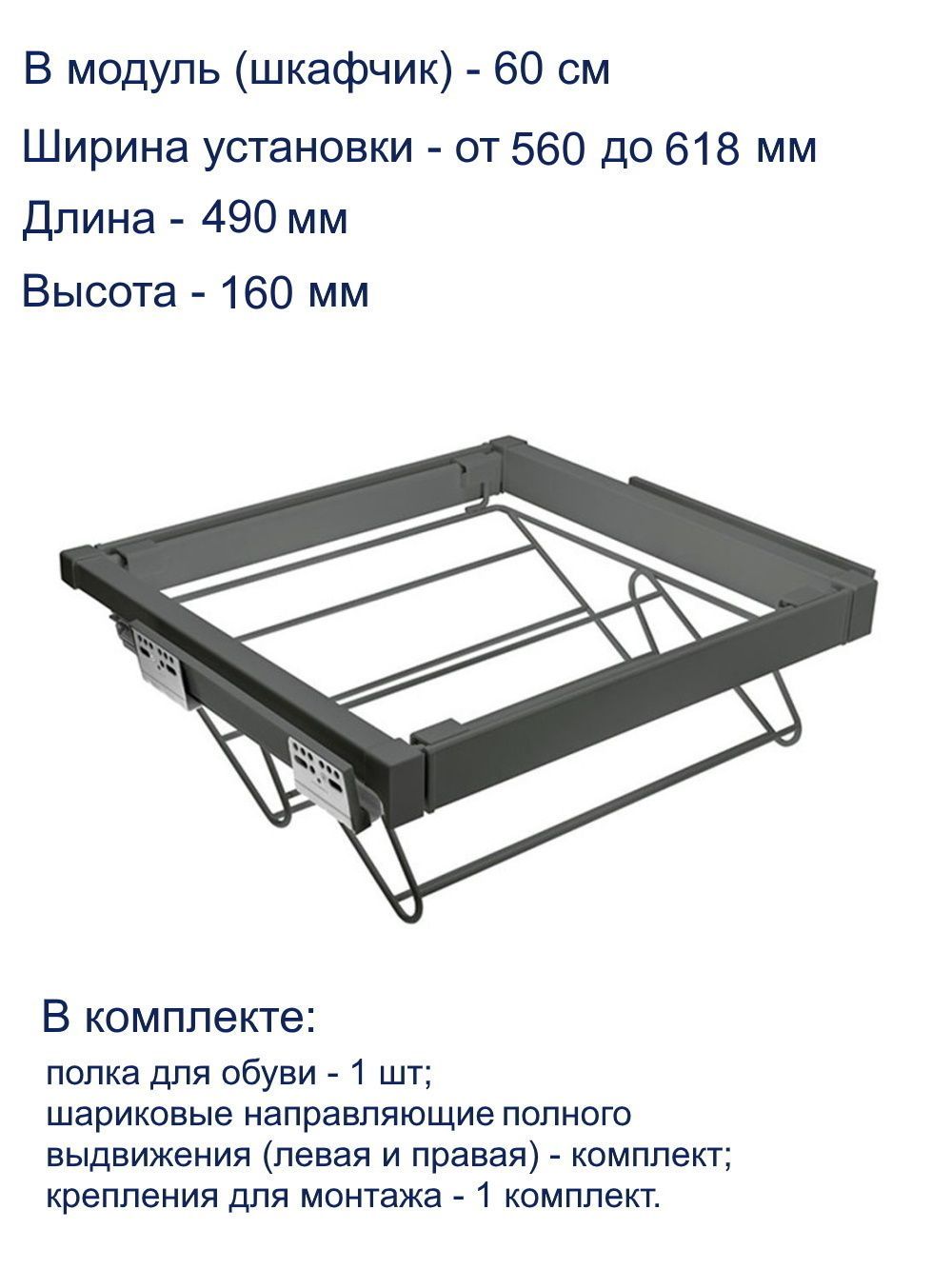 Полка для обуви WG-POBUW60-60, графит, с доводчиком, полного выдвижения - практичный элемент гардеробного наполнения, предназначенный для хранения обуви различного типа и быстрого доступа к ней.
