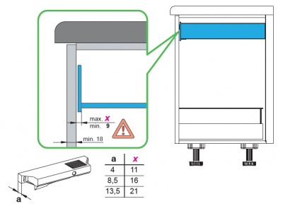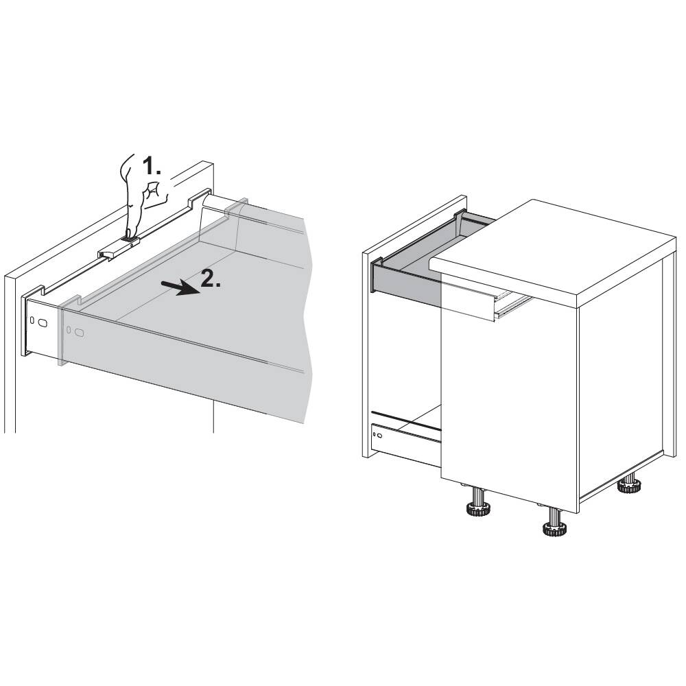 С таким фиксатором внутренний ящик можно открывать одновременно с фасадом. При необходимости закрыть ящик отдельно от фасада, фиксатор легко размыкается простым нажатием на клавишу.