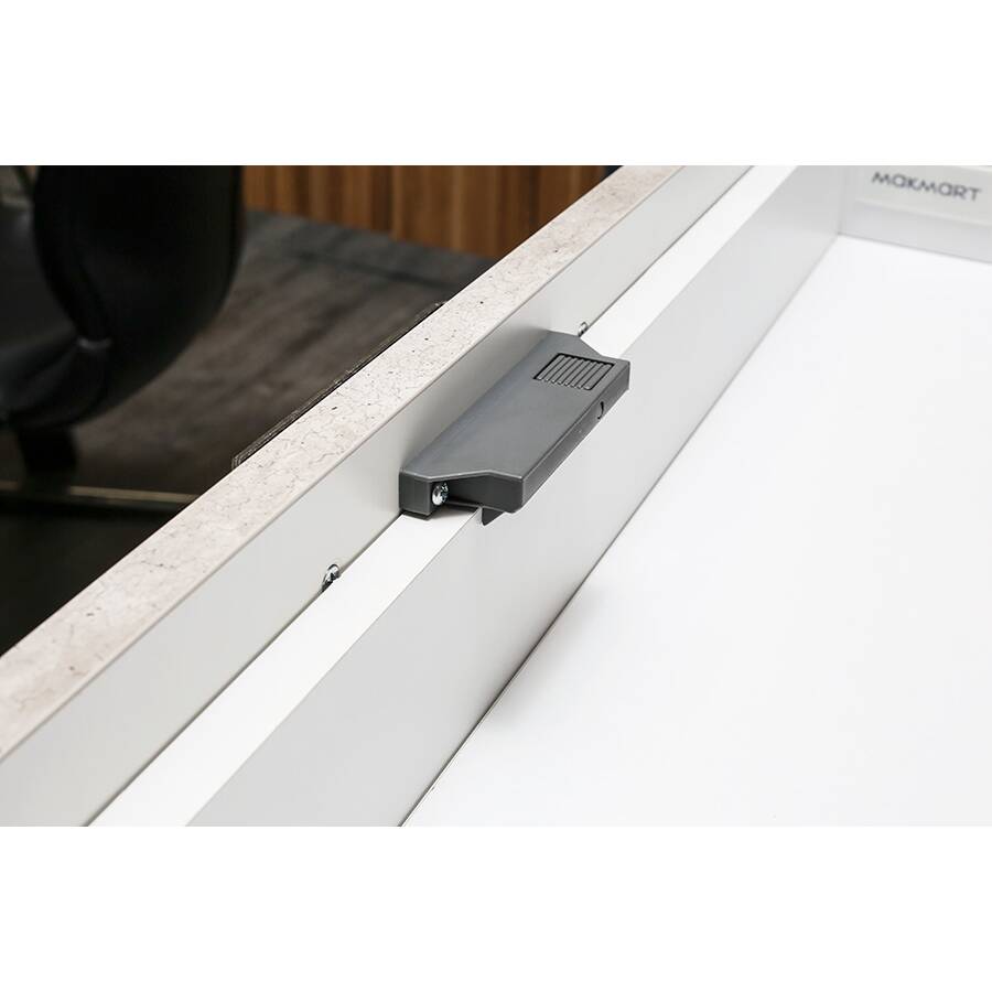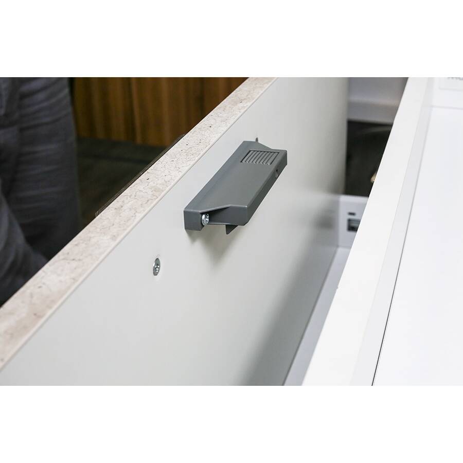 С таким фиксатором внутренний ящик можно открывать одновременно с фасадом. При необходимости закрыть ящик отдельно от фасада, фиксатор легко размыкается простым нажатием на клавишу.
