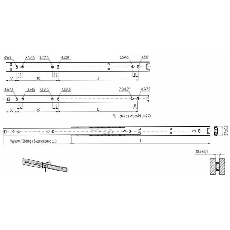 Направляющие шариковые, неполного выдвижения, 27/500 - механизмы частичного выдвижения, используемые при сборке выкатных ящиков, которые не предполагают нагрузку более 15 кг.