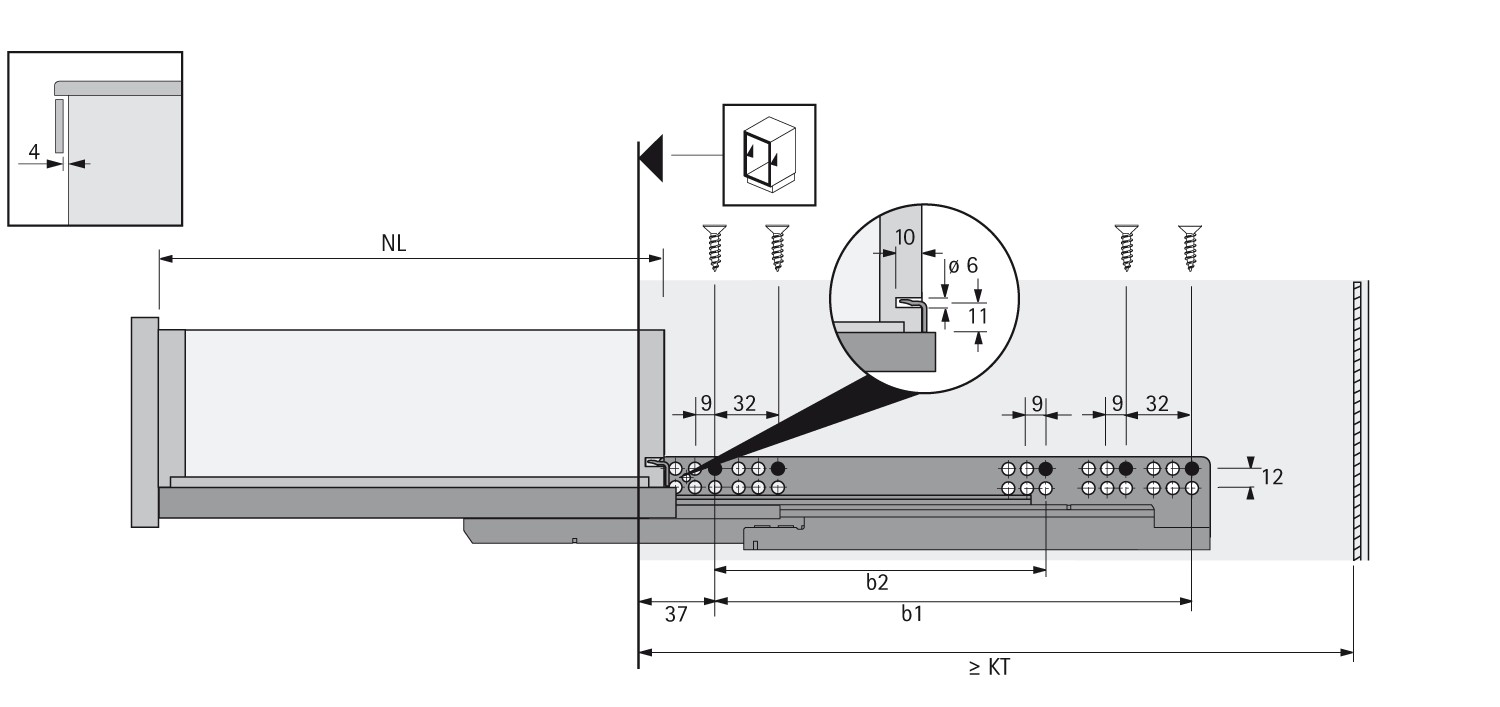 При использовании фиксаторов/деталей крепления для выдвижных полок длину полки необходимо уменьшить на 12 мм (номинальная длина NL - 12 мм)
