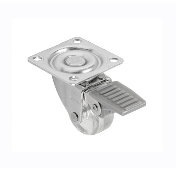 Колесо поворотное, D-35мм, прозрачное, на площадке, со стопором - подвижный элемент мебельной конструкции, используемый в креслах, передвижных столах и тумбочках. Крепится к мебели посредством металлической пластины (площадки).