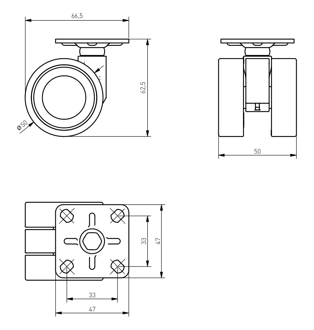 Колесо мебельное CIRCO, d-50мм, серое, без стопора - опора для передвижных мебельных конструкций. Крепится к мебели посредством металлической пластины (площадки) 42x42 мм.