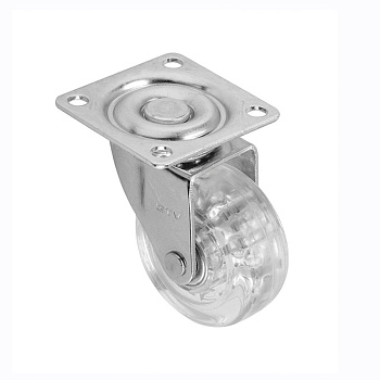 Колесо поворотное, D-50мм, прозрачное, на площадке - подвижный элемент мебельной конструкции, используемый в креслах, передвижных столах и тумбочках. Крепится к мебели посредством металлической пластины (площадки).