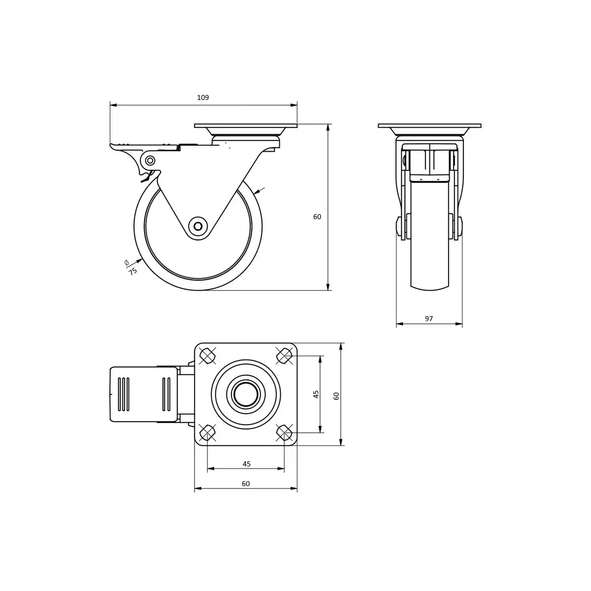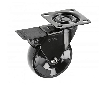 Колесо мебельное CALIBRO, d-75мм, черное, со стопором - опора для передвижных мебельных конструкций. Крепится к мебели посредством металлической пластины (площадки) 60x60 мм.