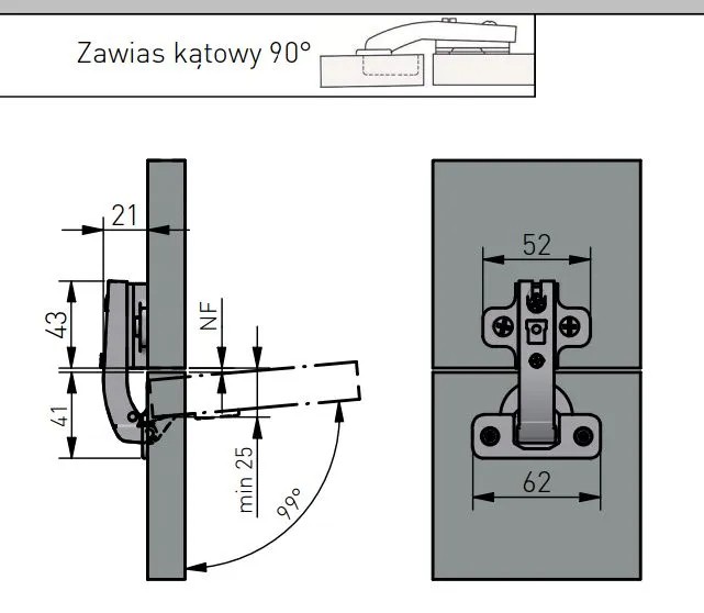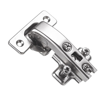 Петля 90° также называется "равнолежащая". Устанавливается в мебельных конструкциях с фальшпанелями. Фасад крепится к корпусу шкафа в одной плоскости.