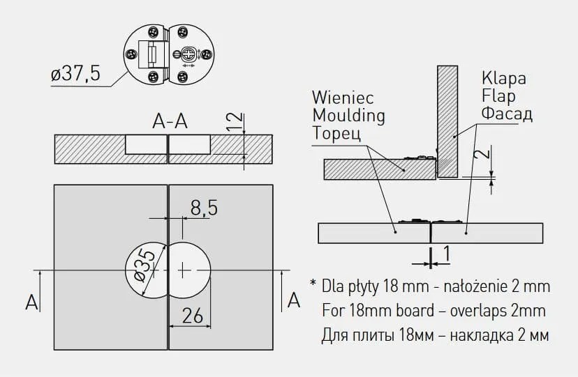 Для плавного открывания и закрывания фасада, рекомендуется использовать петли с соответствующими подъемниками GTV (PD-MDLIFT-P1-D, PD-MDLIFT-P2-D), приобретаемыми отдельно.