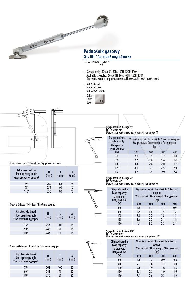 В качестве основного параметра газлифта также может быть указана сила сжатия, измеряемая в Ньютонах (N). 1 кг примерно соответствует 10N. Для комфортной и долговечной эксплуатации рекомендуется устанавливать два газлифта на один фасад.