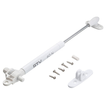 Подъёмник газовый, с амортизатором, 60N, GTV, белый - мебельный подъемник, в конструкции которого предусмотрен амортизатор. При правильной регулировке газлифта, в момент закрывании фасада исключается удар и сопутствующий ему шум.