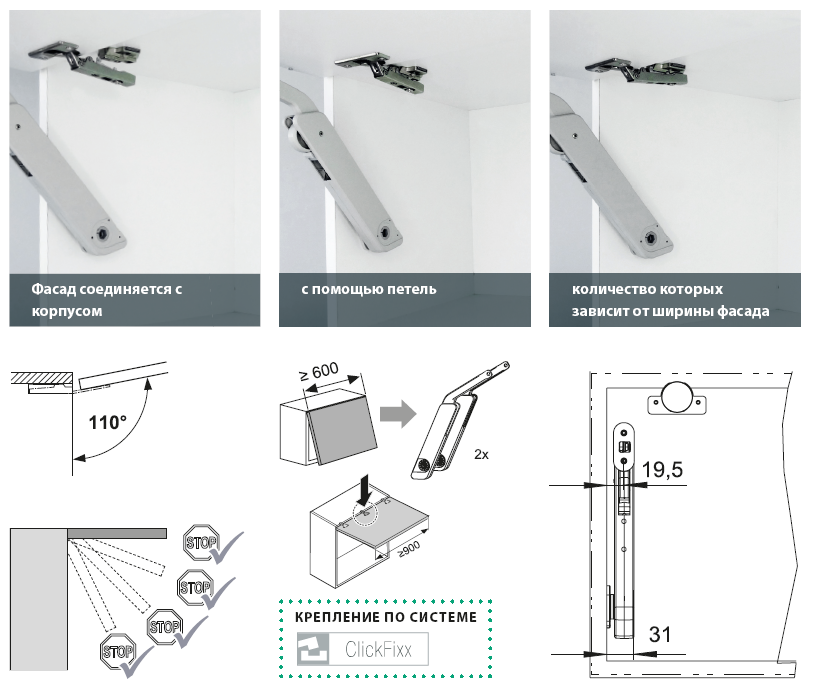 - Многофункциональный подъемный механизм для различного типа открывания: стандартное, полностью автоматическое Touch Opening или частично автоматическое Push-to-open (для установки без ручки)
