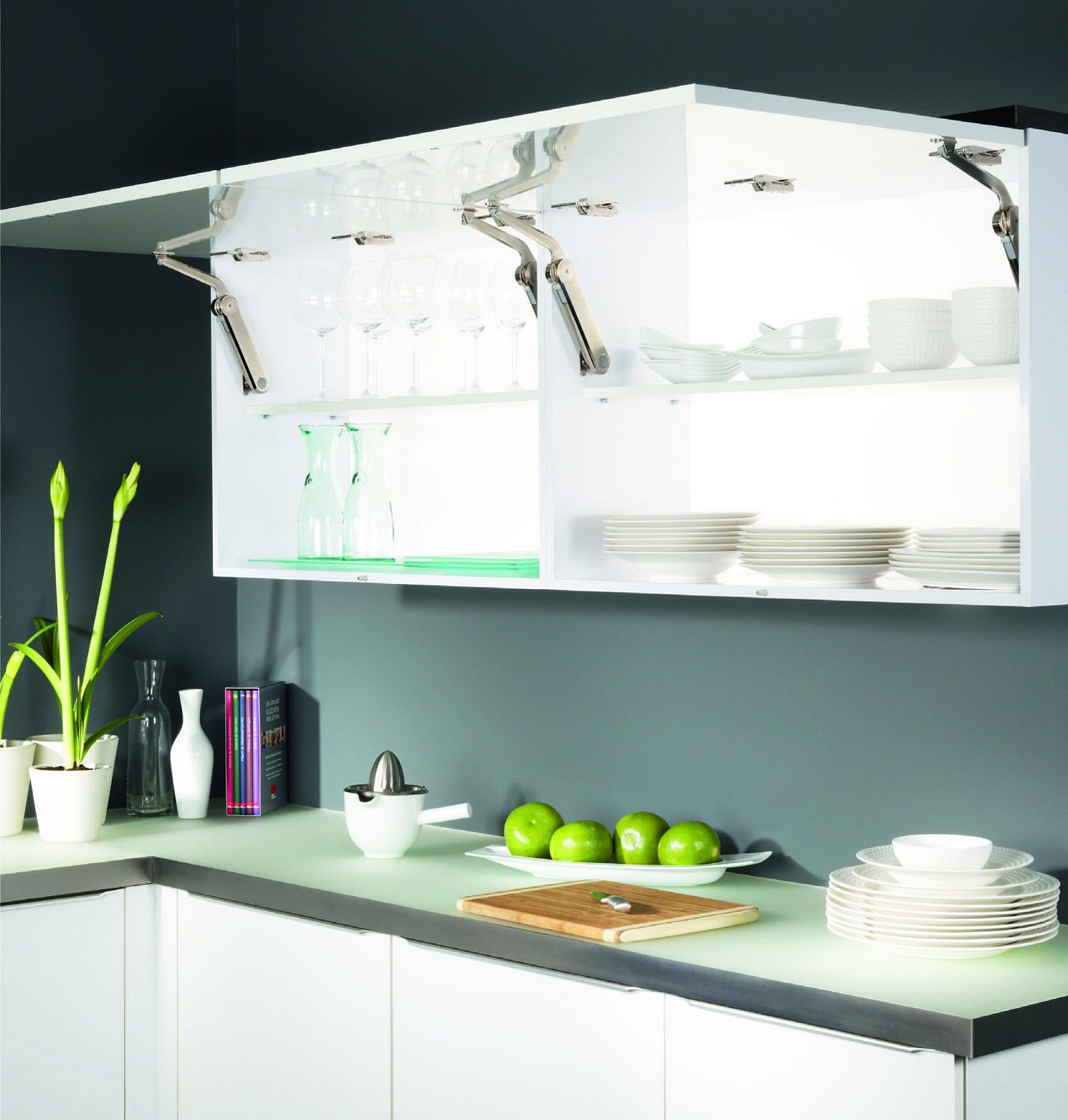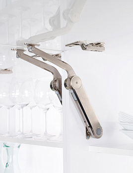 Механизм Maxi предназначен для открывания вверх фасадов весом от 0,7 до 27,3 кг и высотой до 1000 мм. Имеет регулировку усилия в зависимости от веса фасада. Благодаря Multi Position STOP и Soft STOP движения остаются впечатляюще плавными и легкими.