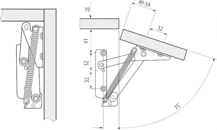 Кронштейн барный "Junior", угол открывания 75 гр. - механический подъемник для деревянных фасадов, работающий за счет пружины и открывающий дверцу вниз. Устанавливается парой, слева и справа фасада.