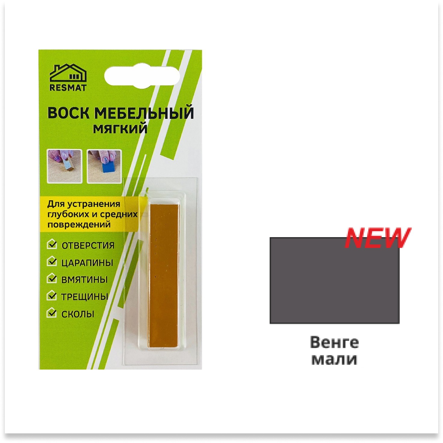 Предназначен для заделки сколов, царапин и трещин на деревянных и ламинированных поверхностях (корпусная мебель, паркет, ламинат, двери, МДФ-панели и др.). Обеспечивает влагостойкость поврежденного участка.