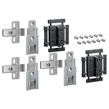Комплект содержит 3 средние петли с точной регулировкой по высоте и регулировкой фуги для складных дверей с 2 створками, крепеж и монтажный шаблон