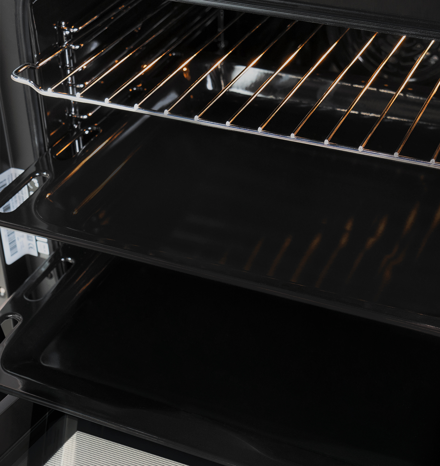 Благодаря хромированным направляющим, эмали легкой очистки, возможности снять дверцу за духовым шкафом несложно ухаживать.