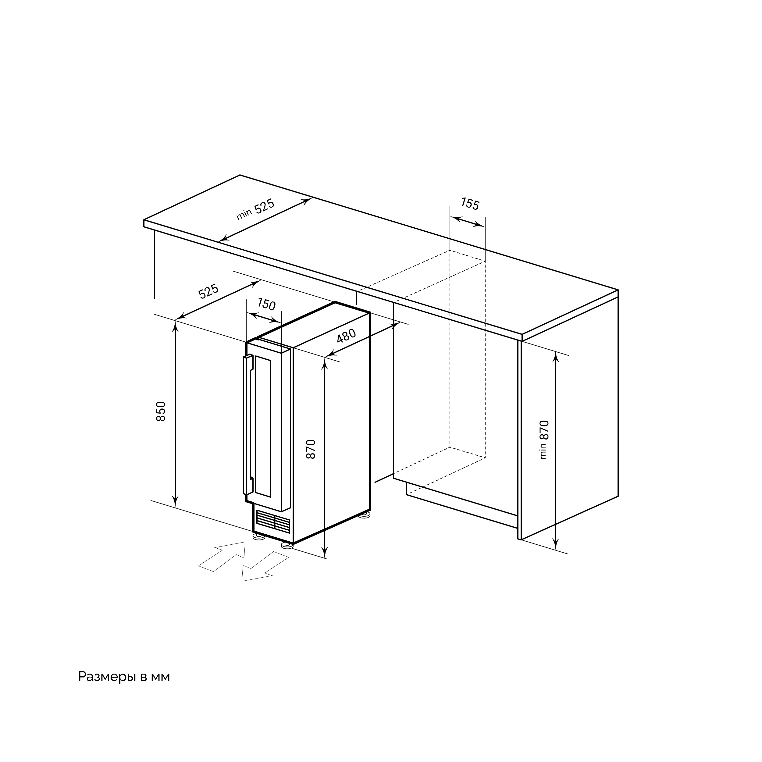 Благодаря компактным размерам (870×150×525 мм), шкаф легко поместится под столешницу или в ограниченном пространстве. Шесть полок обеспечивают гибкость в размещении бутылок различных размеров.