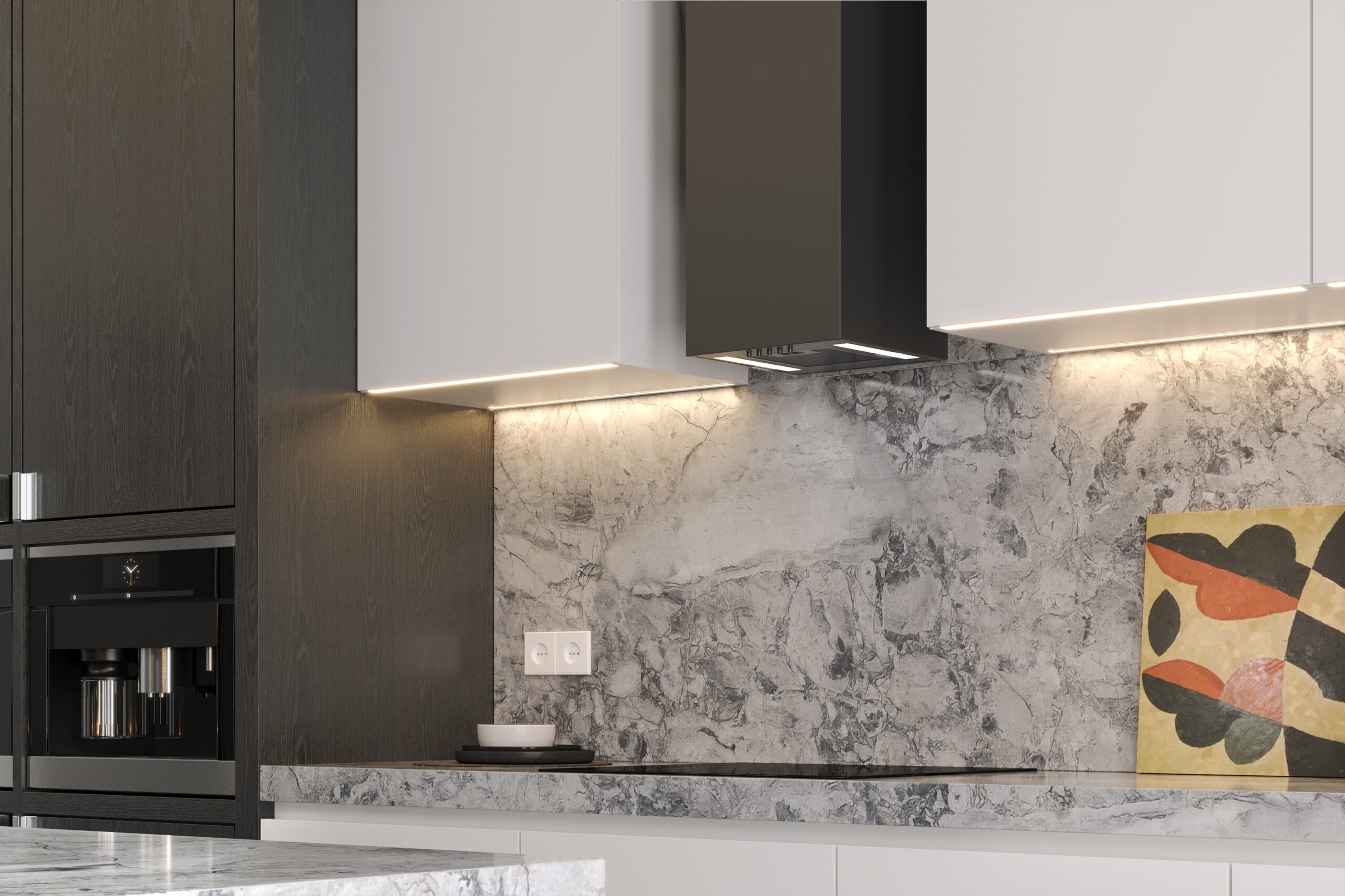 Настенная вытяжка в форме прямоугольного параллелепипеда. Геометрические формы повсеместно используется в современных дизайнерских проектах, они ассоциируются с простотой и лаконичностью, привносят в помещение гармонию и стиль