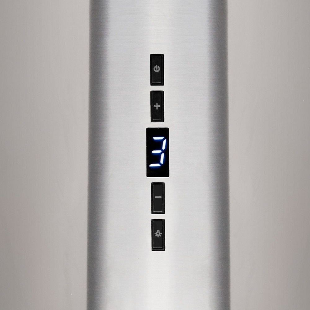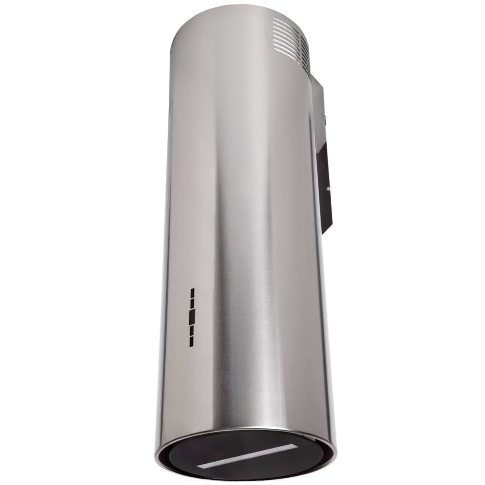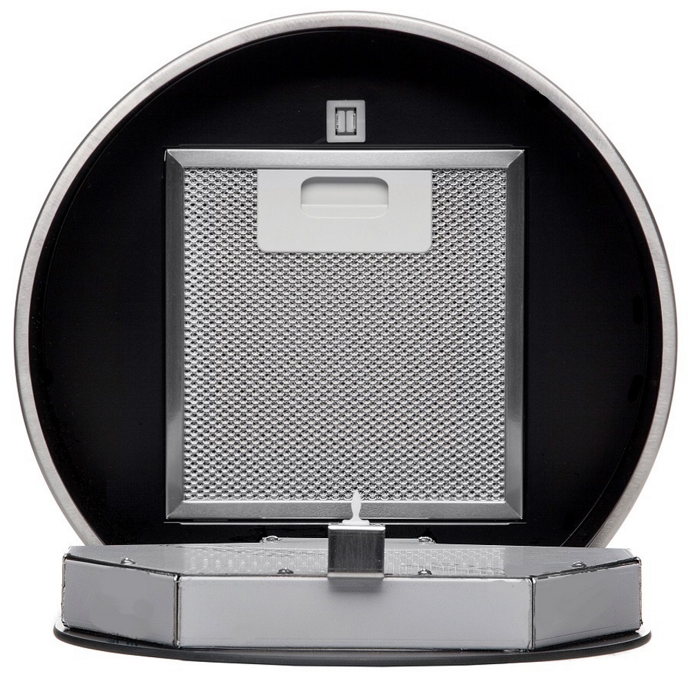 - Вытяжка выполнена в форме цилиндра. Геометрические формы повсеместно используется в современных дизайнерских проектах, они ассоциируются с простотой и лаконичностью, привносят в помещение гармонию и стиль. Стильное сочетание стали и блеска закаленного стекла создают ощущение легкости прочной конструкции. Декоративный стеклянный люк скрывает алюминиевый, жироулавливающий фильтр, придавая завершенность композиции