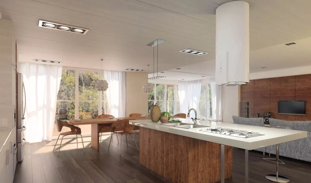Островная вытяжка - это уже не только необходимое устройство, но и фантастический элемент интерьера. Сочетания цилиндрического корпуса с прямоугольной панелью управления и круглой декоративной панелью освещения создают стильную геометрию, привлекают лаконичностью и правильностью форм.