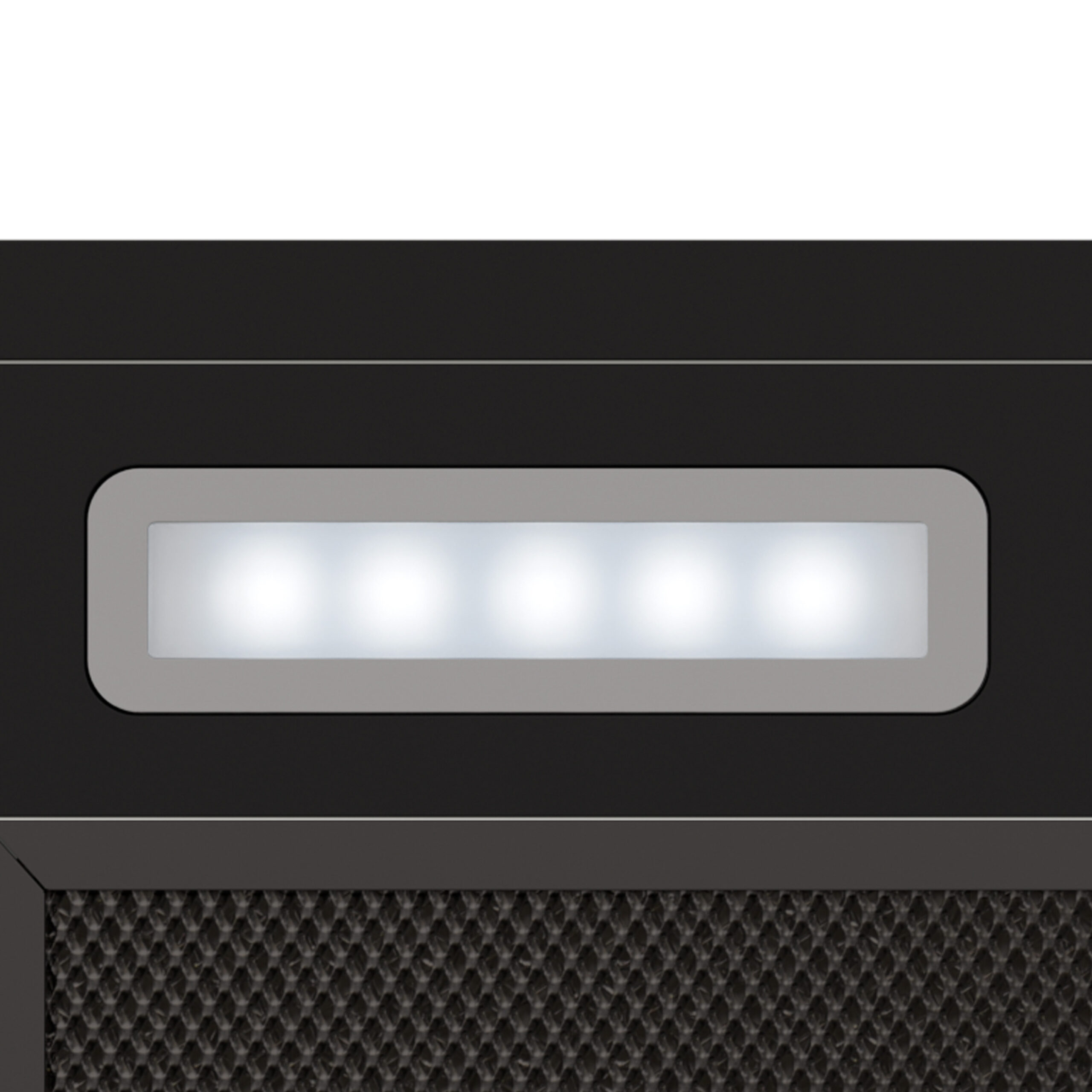 Освещение с помощью LED-ламп мощностью 2 Вт обеспечивает яркий и равномерный свет, экономя электроэнергию. Алюминиевый фильтр легко моется, а угольные фильтры доступны в качестве опции для работы в режиме рециркуляции.