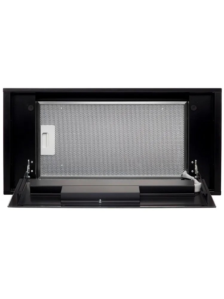 Вытяжка полностью закрывает нижний горизонт шкафчика и может монтироваться вместо нижней полки