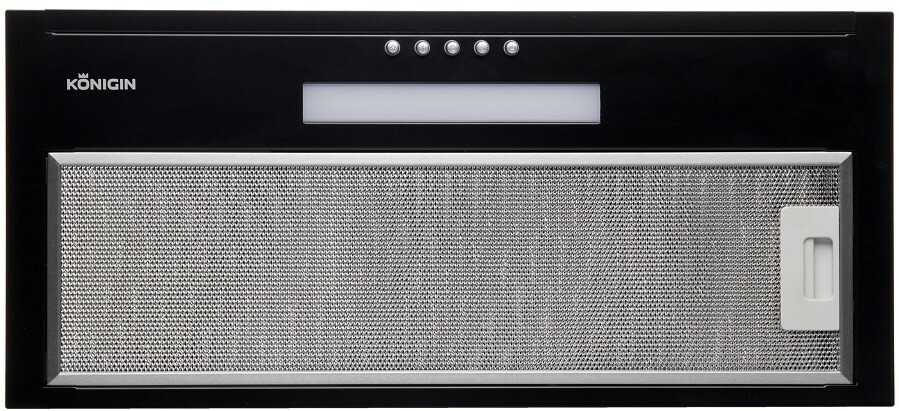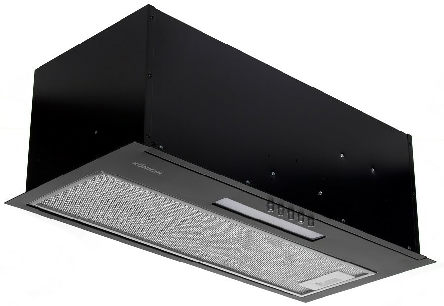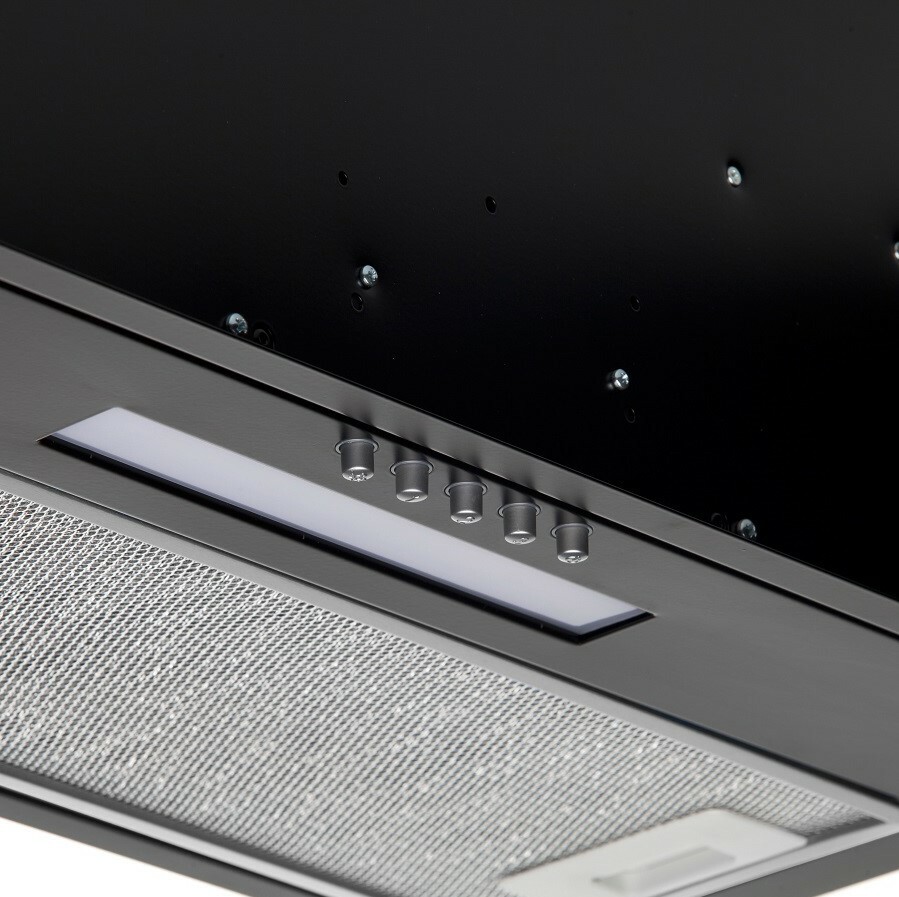 Фасад вытяжки полностью закрывает нижнюю полку – это позволяет монтировать вытяжку в кухонные шкафчики вместо нижней полки (дна). Удобная система монтажа