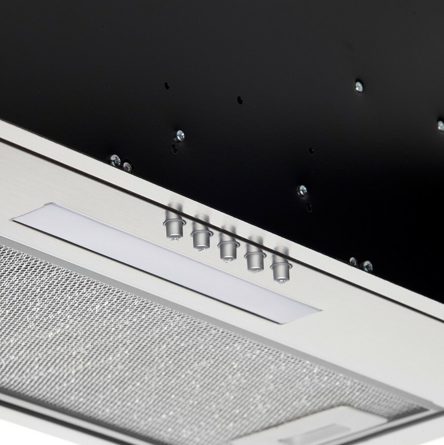 Фасад вытяжки полностью закрывает нижнюю полку – это позволяет монтировать вытяжку в кухонные шкафчики вместо нижней полки (дна). Удобная система монтажа